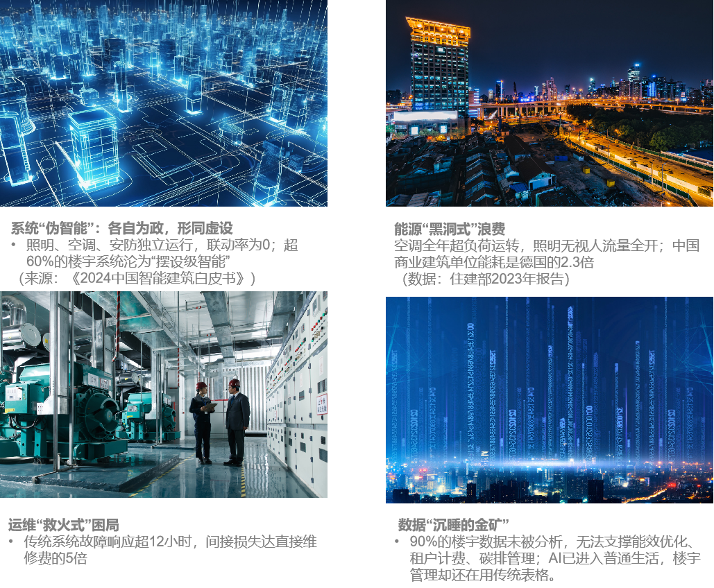 当前,楼宇系统在各类建筑中得到广泛应用,但实际使用情况参差不齐。许多系统未能充分发挥其潜力,存在智能化低、能源浪费、运维脱节和数据沉睡等问题。多数系统仅实现基本自动化(如定时开关照明、空调温度控制),缺乏深度集成和智能化功能(如数据分析、自适应优化)。部分楼宇的子系统(如照明、空调、安防)独立运行,缺乏联动,未能实现真正的“智能化”。对于能源管理的部分,简单的能耗数据记录,缺乏深入分析和优化建议。单一的控制策略无法根据实时环境和实际需求优化,节能效果不显著。在当前AI技术不断地被普通人使用的今天,楼宇自控的智能化水平仍处于较低的水平,未能引入人工智能进行优化。